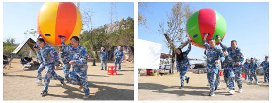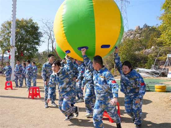 隨后的“運轉乾坤”項目,巨大的充氣球需要團隊成員共同發力,協調步伐才能快速前進。